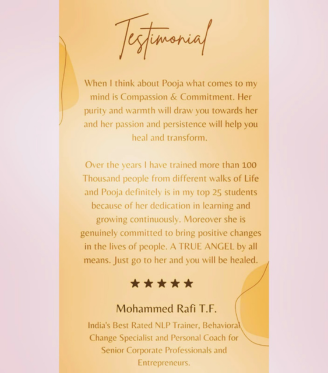 I’m proud to have supported a diverse clientele from all across India, as well as international clients from the UK and Dubai. Many have shared heartwarming stories of their journeys toward reduced anxiety, improved relationships, a reinvigorated sense of self-worth,and realising their goals and the life shifts that they desired.